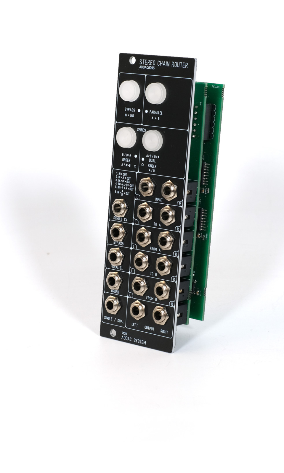 ADDAC809S is a dynamic CV operated I/O router that allows two sources (Stereo Audio or CV) to be routed through 2 different chains (of one or more modules) before being sent to an output. Six routing patterns are allowed: