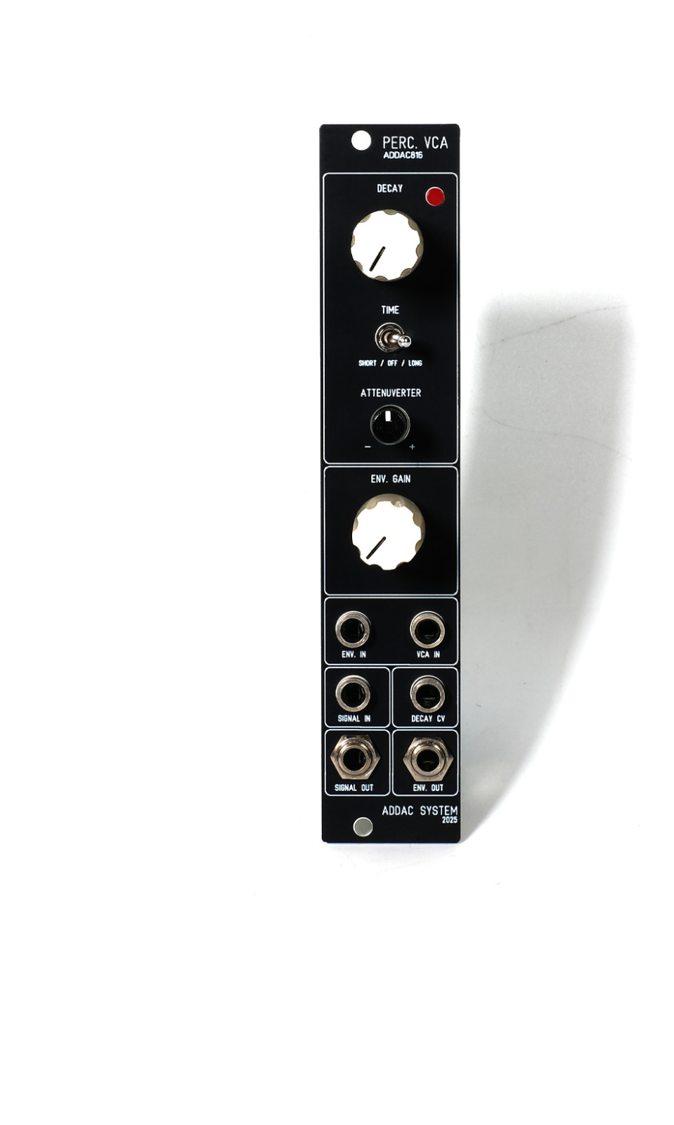 We named it Percussion VCA as most percussion intruments have sharp attacks with variable decays just as its AD Envelope however it can be used for any purpose where a VCA is needed including for CV signals due to it’s DC coupled signal path.